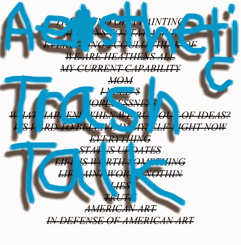 I wanted the selection to run the gamut between color and texture, subject matter and application, insider tricks, formal tweaks, high and low, between trepidation and delight, dry and wet, between introspection and brute execution. The selection is indicative of the way my logic free associates quickly between seemingly unrelated references, and inside of my making practice I very seldom restrict the process from this same fluid shifting and pivoting. I have never made a playlist that contains one single genre of music.