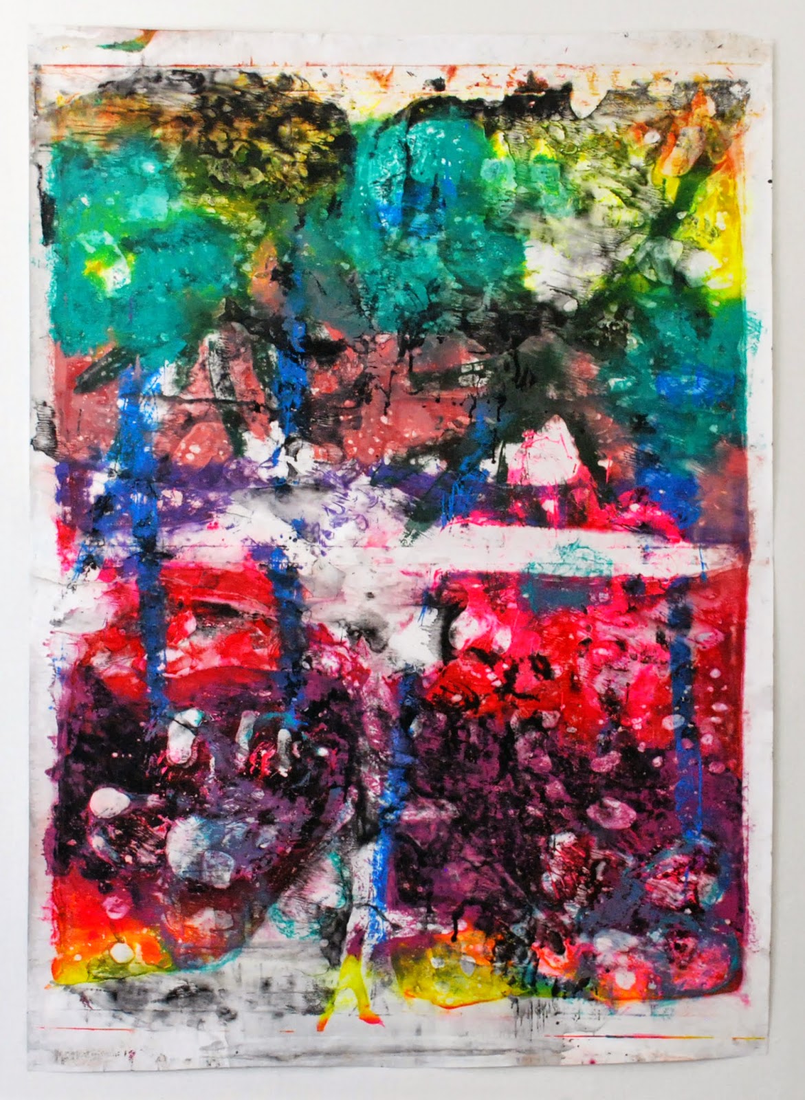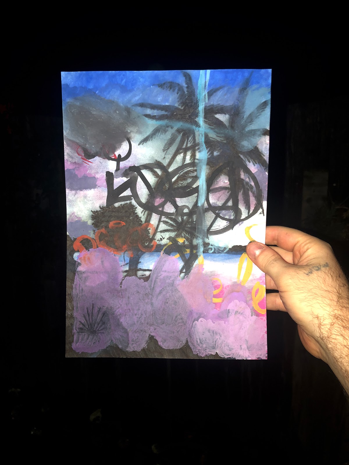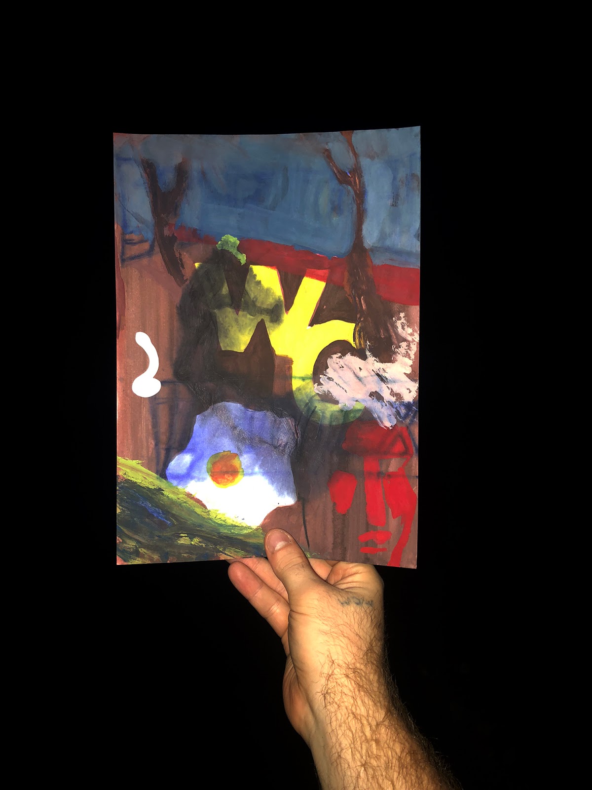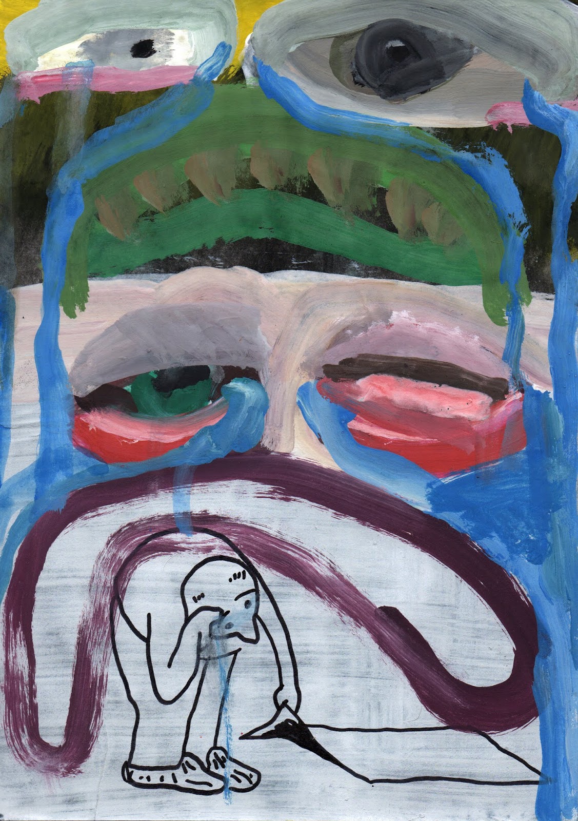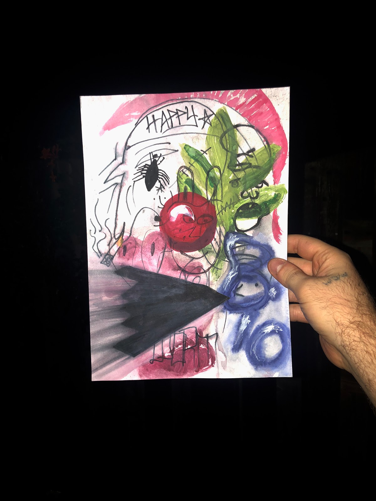 I live in a five hundred person town in the countryside in Spain and I can't drive. I spend all day, every day making watercolours now. These days I only leave my house to find new fragments to use. Im "going to buy bread", but really I’m hunting for shapes, colours, solutions, some stupid any-thing to juxtapose against something else, on top, under. I look for the perfect twisted old olive tree whose form converts into the abstract shape that will solve a painting. The SpongeBob Square pants mesh baby visor suction cupped to the inside of a minivan window. I had an orgasm the other day and precisely at that moment an image of a fluffy sheep exploded into my head and I ran to paint the sheep, solving a problem.