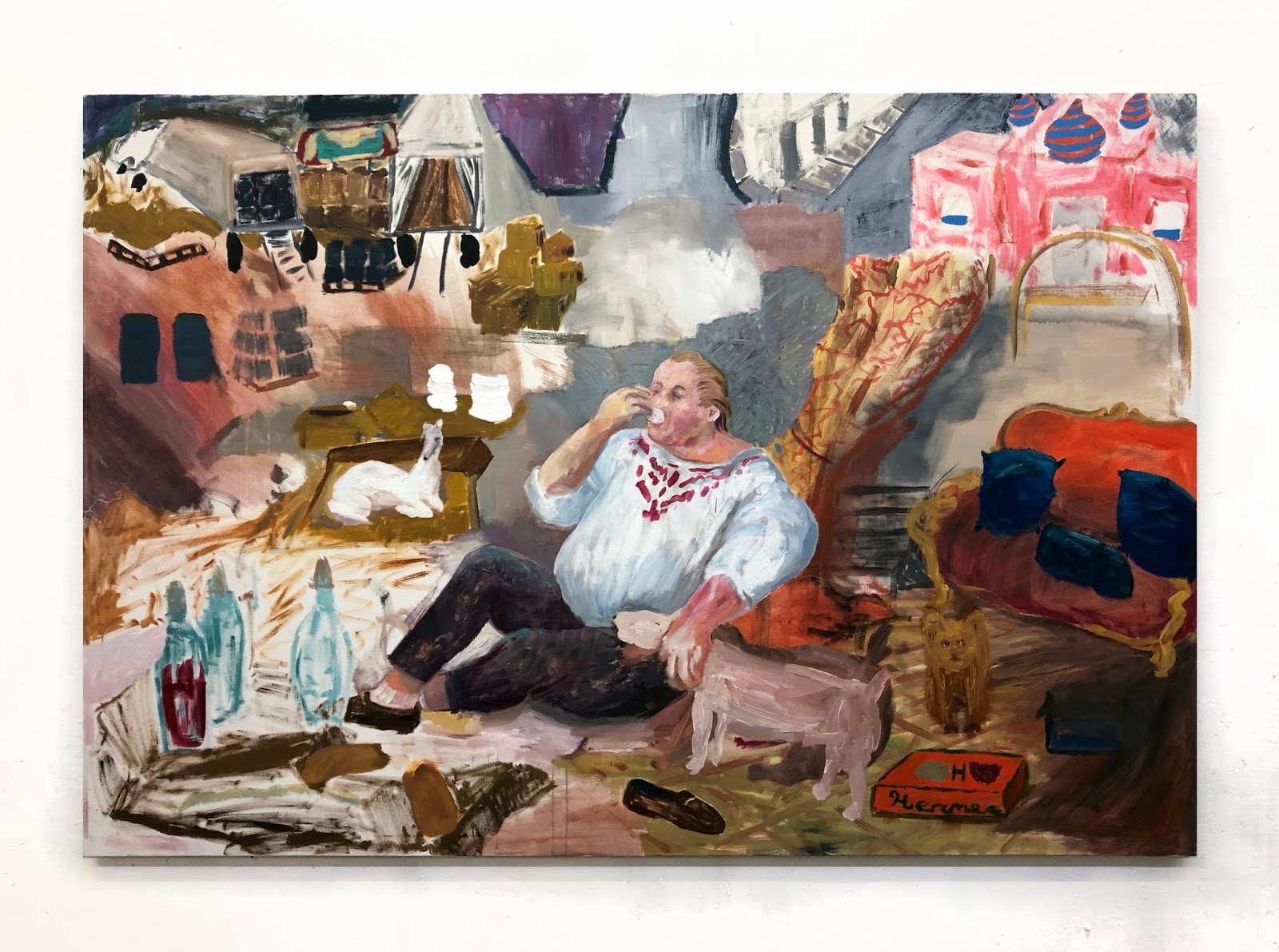 I live in a five hundred person town in the countryside in Spain and I can't drive. I spend all day, every day making watercolours now. These days I only leave my house to find new fragments to use. Im "going to buy bread", but really I’m hunting for shapes, colours, solutions, some stupid any-thing to juxtapose against something else, on top, under. I look for the perfect twisted old olive tree whose form converts into the abstract shape that will solve a painting. The SpongeBob Square pants mesh baby visor suction cupped to the inside of a minivan window. I had an orgasm the other day and precisely at that moment an image of a fluffy sheep exploded into my head and I ran to paint the sheep, solving a problem.
