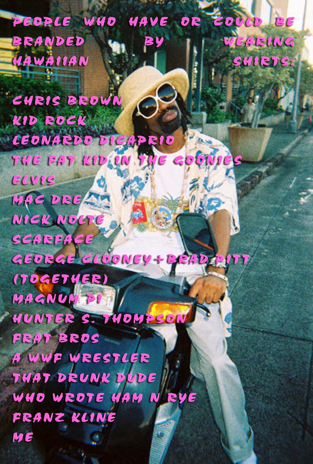 | There was a time when I really pondered the implications of wearing hawaiian tshirts. The topic no longer interests me. |
